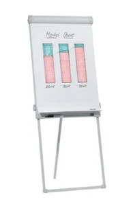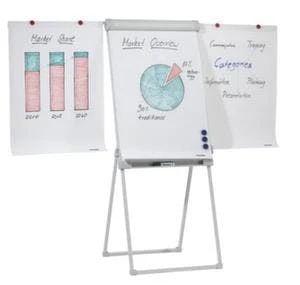 Flipchart, Höhe 1100 – 1880 mm, Tafel Höhe x Breite 950 x 670 mm, Tafeloberfläche magnethaftend, beschriftbar und trocken abwischbar, Tafel aus Stahl in weiß, in der niedrigsten Höhe auch im Sitzen nutzbar, 2 seitlich ausklappbare Papierhalter und Ablageschale, Rahmen aus Stahl in weiß, Gestell aus Stahl in weiß, 4 Füße, platzsparend zusammenklappbar.