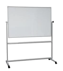 Mobile Drehtafel, Höhe 1880 mm, Tafel Höhe x Breite 900 x 1200 mm, Tafeloberfläche mit Lackierung, magnethaftend, beschriftbar, trocken und nass abwischbar, Tafel aus Stahl in weiß, Tafelfläche um 360° drehbar und stufenlos arretierbar, 2 Schreibflächen und Ablageschale, Rahmen aus Aluminium in silber, Gestell aus Aluminium.