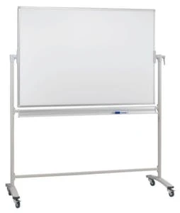 Mobile Drehtafel, Höhe 1950 mm, Tafel Höhe x Breite 1200 x 1800 mm, Tafeloberfläche mit Lackierung, magnethaftend, beschriftbar, trocken und nass abwischbar, Tafel in weiß, Tafelfläche um 360° drehbar und stufenlos arretierbar, 2 Schreibflächen und Ablageschale, Rahmen aus Aluminium eloxiert in silber, mit 4 Lenkrollen, davon 2 mit Feststeller.