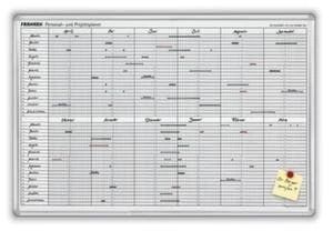 Personal- und Projektplaner, Höhe x Breite 600 x 900 mm, Tafeloberfläche magnethaftend, beschriftbar und trocken abwischbar, Tafel aus Stahl in weiß, Jahresübersicht für 24 Positionen, 2 Schreiber, 3 Magnete und Ablageschale, Rahmen aus Aluminium eloxiert in silber.