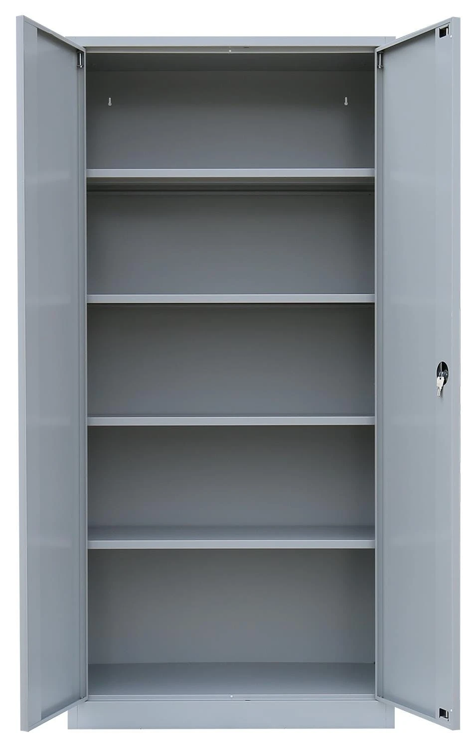 Stahl-AktenschrankLanglebige, pflegeleichte, verschweißte Stahl-Konstruktion 4 Fachböden, 5 Ordnerhöhen Schranktüren jeweils rechts und links angeschlagen, an gefederten Stiftscharnieren befestigt, mittig schließend Kastenverstärkung für eine erhöhte Türstabilität Flexible Nutzung als Aktenschrank oder Regal durch herausnehmbare Flügeltüren Geräuschdämpfende Kunststoff-Türanschlagspuffer serienmäßig Individuelle, flexible Innen-Einteilung durch höhenverstellbare Einlegeböden, im 5cm-Raster Tragkraft der herausnehmbaren Einlegeböden bis zu 65 kg Einlegeböden serienmäßig in Korpusfarbe ausgeführt 2-Wege-Schubstangenzylinderschloss mit Drehgriff, inkl. 2 Schlüssel Korpus und Türen elektrostatisch, glatt pulverbeschichtet Qualität und Sicherheit Komplett verschweißt, keine Montage erforderlich, nur Fachböden müssen eingelegt werdenMaße: 1950 x 925 x 600 mm (HxBxT) Farbe: Korpus in RAL 7035 Lichtgrau Farbe Türen: RAL 3000 Feuerrot