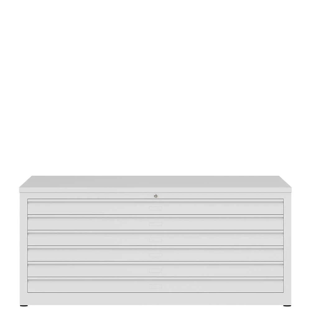 Hochwertiger Profi DIN-A0-Stahl-Zeichnungsschrank/ Flachablageschrank für DIN A0 Grafiken/Baupläne/Zeichnungen mit 6 Schubladen. Ideal geeignet für Architekten,Bauzeichner, Künstler, Sammler etc. Die Schubladen auf Präzisions-Teleskopführungen sind mit Auszugssperren versehen. Die durchgehende Griffleiste ermöglicht ein leichtes und angenehmes Öffnen der Schubladen. Die Schubladen sind zentral verschließbar durch ein Zylinderschloss inkl. 2 Schlüssel. Max. Schubladenauszug 700 mm. Der Schrank ist fertig montiert. Pulverbeschichteter Korpus und Schubladen, melaminharzbeschichtete Holz-Abdeckplatte. Maße: 605 x 1405 x 955 mm (Höhe x Breite x Tiefe) Material: Langlebige, geschweißte Stahlblechkonstruktion, melaminharzbeschichtete Holzabdeckplatte Farbe: Korpus: RAL 9003 Weiß, Abdeckplatte: RAL 9003 Weiß