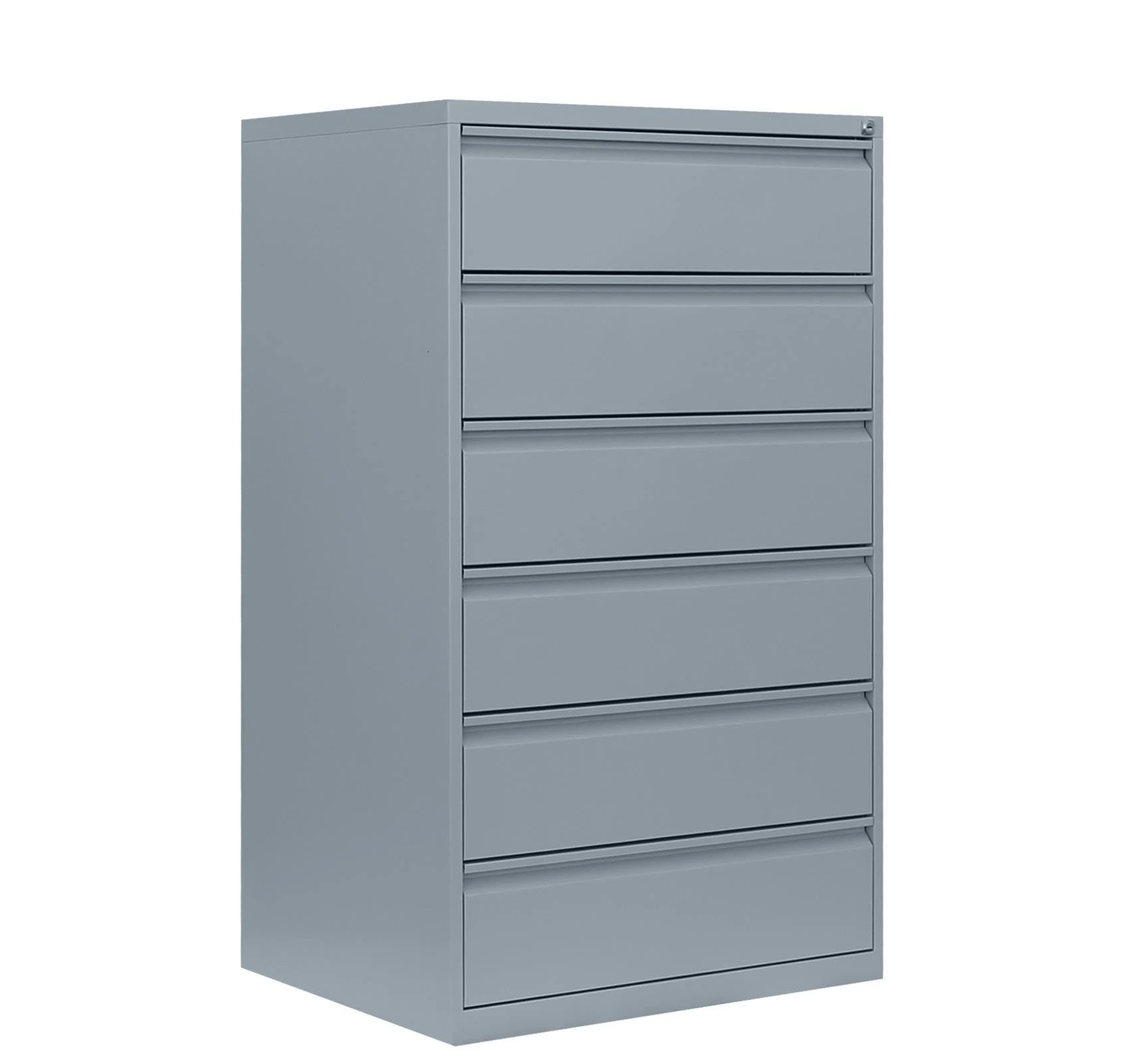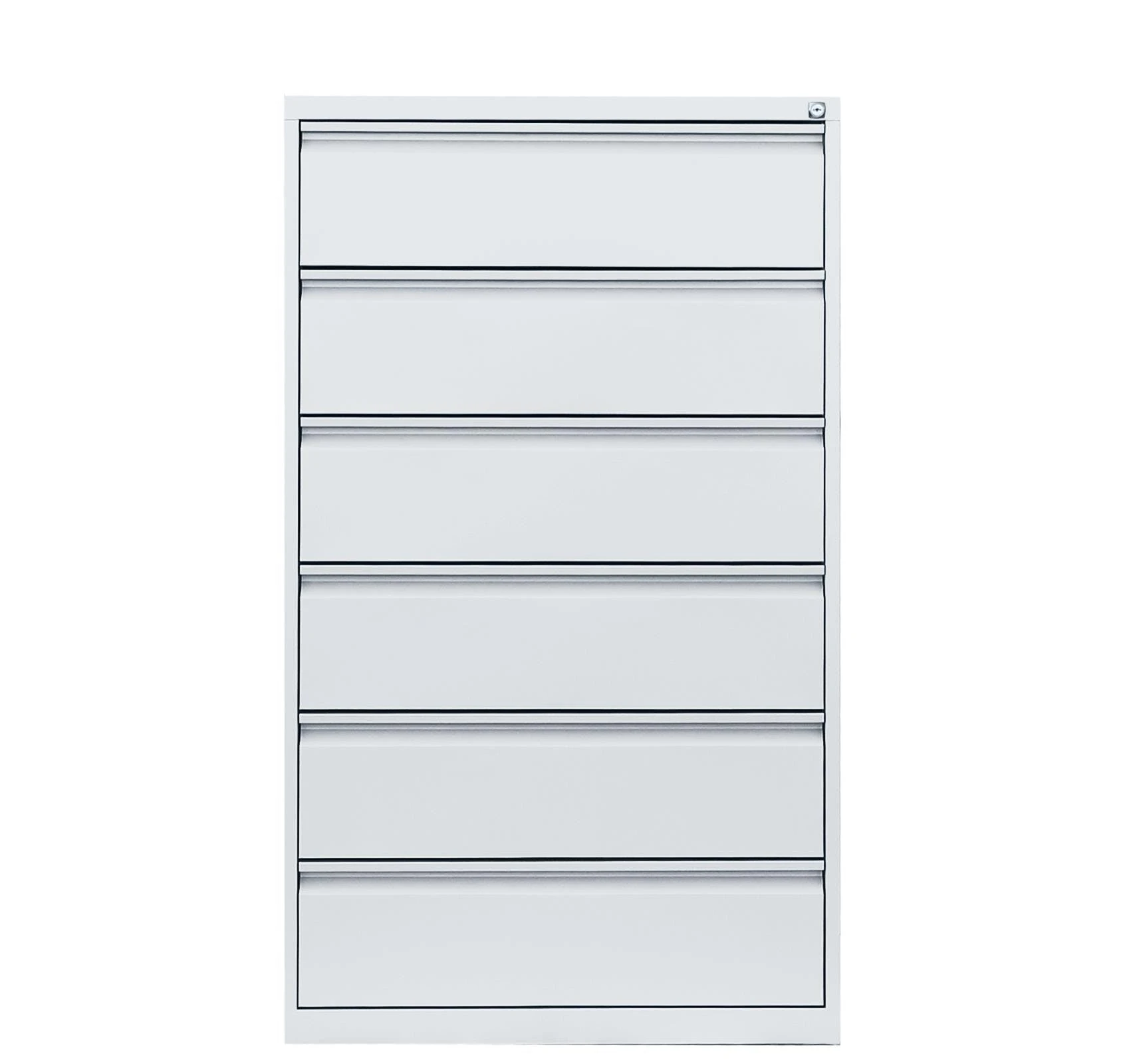 Hochwertiger Profi Stahl-Karteischrank/Karteikartenschrank dreibahnig für Ihr Home Office oder im professionellen Büro-Einsatz. Der Stahl-Karteikartenschrank ist mit 6 dreibahnigen Schubladen und einer Stahl-Abdeckplatte ausgestattet und bietet Stauraum für DIN A5 Karteikarten.Schubladen mit geschlossenen Böden, auf Präzisions-Teleskopführungen sind zu fast 100% ausziehbar und mit Auszugssperren versehen. Die Auszugssperren verhindern des gleichzeitigen Öffnen aller Schubladen und somit das Umkippen des Schrankes. Die durchgehende Griffleiste ermöglicht ein leichtes und angenehmes Öffnen der Schubladen. Die Schubladen sind zentral verschließbar durch ein Zylinderschloss inkl. 2 Schlüssel. Aufklebbare Etikettenfenster sind beiliegend. Der Schrank ist fertig montiert. Der Korpus und die Schubladen sind pulverbeschichtet. Maße: 1320 x 760 x 620 mm (Höhe x Breite x Tiefe) Material: Langlebige, geschweißte Stahlblechkonstruktion Farbe: RAL 9003 Weiß
