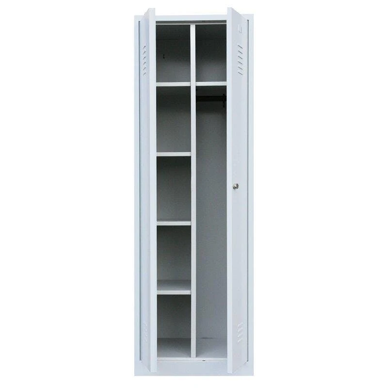 Mehrzweckschrank/SpindLanglebige, pflegeleichte, verschweißte Stahl-Konstruktion 2 Abteile, Abteilbreite ca. 300 mm Türen jeweils rechts und links angeschlagen, an gefederten Stiftscharnieren befestigt Türen mit Kastenverstärkung, Lüftungsschlitzen und eingestanztem EtikettenrahmenEtikettenrahmen für Etiketten mit den Maßen 3 x 5 cm (B x L) Geräuschdämpfende Kunststoff-Türanschlagspuffer serienmäßig Inneneinteilung: Links: 4 fest verschweißte Fachböden (5 Fächer), Rechts: 1 fest verschweißter Hutboden mit 1 Ovalprofil-Garderobenstange mit 3 verschiebbaren Kunststoff-Kleiderhaken Fach- und Abteilböden glatt auskehrbar Hut- und Fachböden serienmäßig in Korpusfarbe ausgeführt Drehriegelverschluss für Vorhangschloss mit bis zu 5 mm Bügelstärke (Vorhangschloss nicht im Lieferumfang enthalten) Korpus und Türen elektrostatisch, glatt pulverbeschichtet Qualität und Sicherheit Komplett verschweißt, keine Montage erforderlich Maße: 1800 x 600 x 500 mm (HxBxT) Farbe: Korpus in RAL 7035 Lichtgrau, Türen in RAL 7035 Lichtgrau