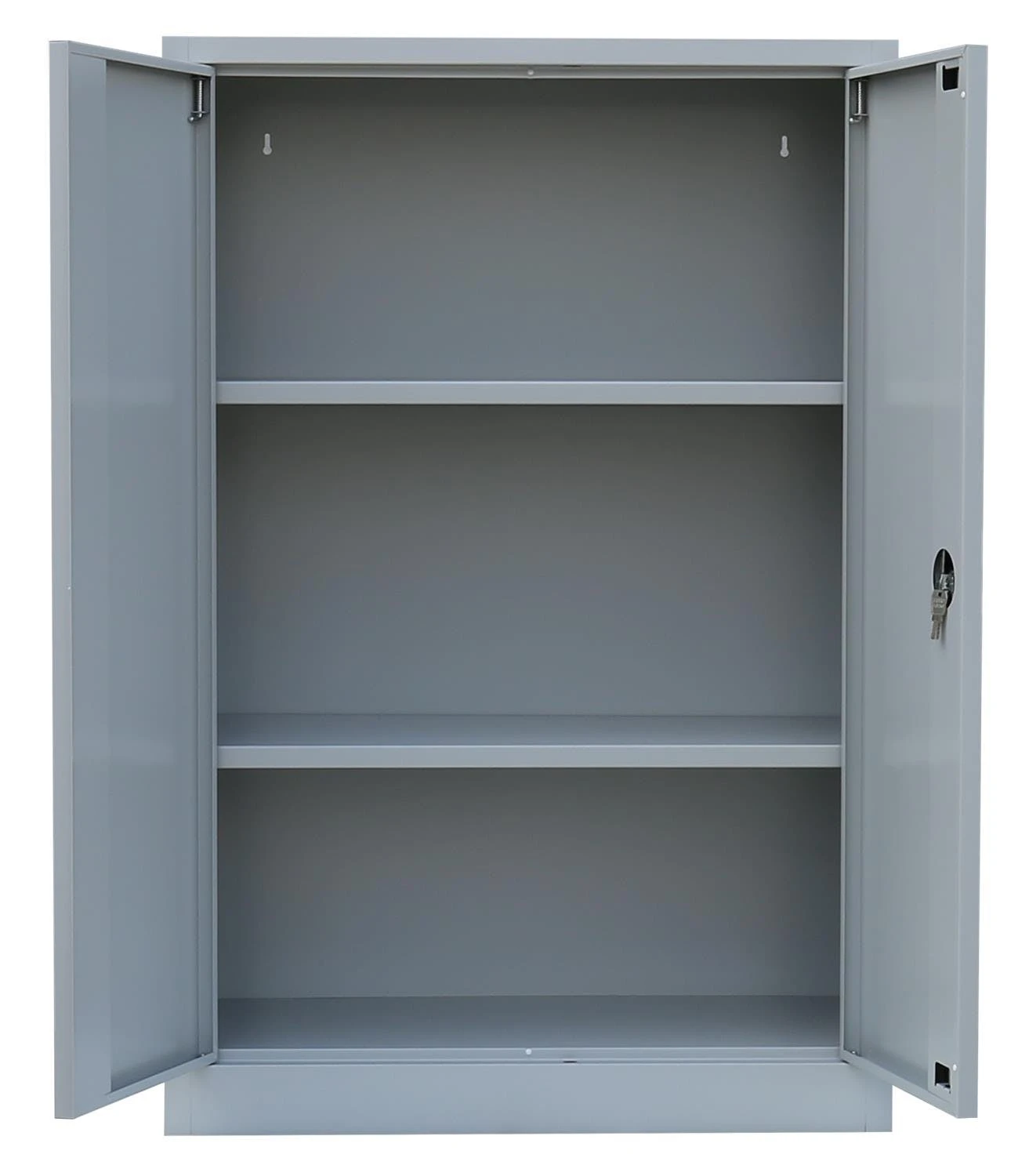Aktenschrank, Büroschrank, Aktenschrank Metall, Ordnerschrank, Lagerschrank, Werkzeugschrank, mit 2 Einlegeböden (3 Ordnerhöhen). Universell einsetzbar zur Lagerung und Ablage von Aktenordnern und Dokumenten, zum sicheren Aufbewahren (abschließbar durch Schubstangen-Zylinderschloss) und Lagern von Werkzeug, Aufbewahrungsboxen, Verkaufsunterlagen, Katalogen, Papier und Schreibmaterial. Ideal geeignet für Büros, Logistik, Lager, Werkstätten und Containerbüros.Langlebige, pflegeleichte, verschweißte Stahl-Konstruktion 2 Fachböden, 3 Ordnerhöhen Schranktüren jeweils rechts und links angeschlagen, an gefederten Stiftscharnieren befestigt, mittig schließend Kastenverstärkung für eine erhöhte Türstabilität Flexible Nutzung als Aktenschrank oder Regal durch herausnehmbare Flügeltüren Geräuschdämpfende Kunststoff-Türanschlagspuffer serienmäßig Individuelle, flexible Innen-Einteilung durch höhenverstellbare Einlegeböden, im 5 cm-Raster Tragkraft der herausnehmbaren Einlegeböden bis zu 65 kg Einlegeböden serienmäßig in Korpusfarbe ausgeführt 2-Wege-Schubstangenzylinderschloss mit Drehgriff, inkl. 2 Schlüssel Korpus und Türen elektrostatisch, glatt pulverbeschichtet Qualität und Sicherheit Komplett verschweißt, keine Montage erforderlich, nur Fachböden müssen eingelegt werden
