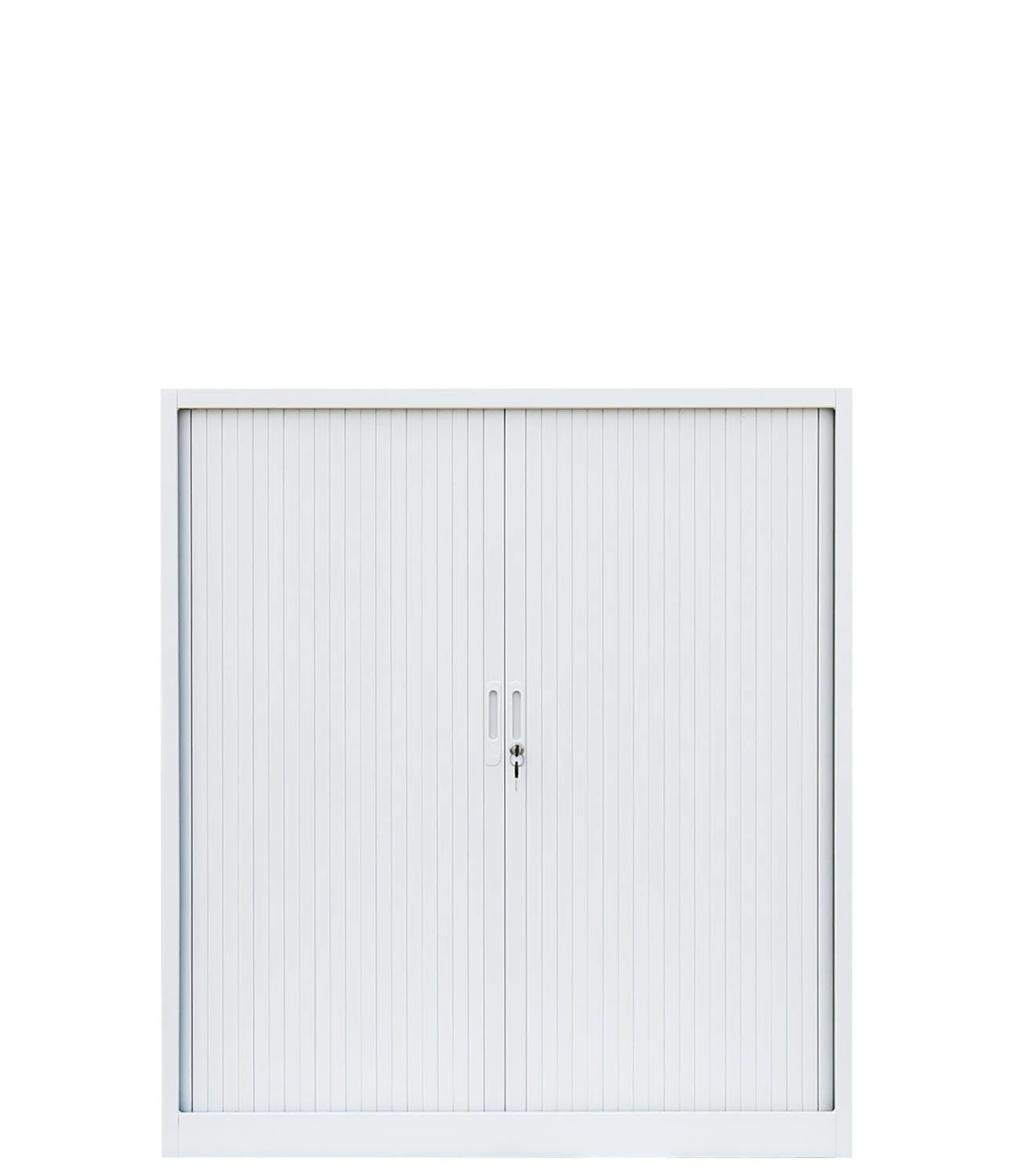 Rollladenschrank / Sideboard / Büro Aktenschrank WeißLanglebige, pflegeleichte, verschweißte Stahl-Konstruktion mit Kunststoff-Rollladentüren Optimal geeignet für enge Raumverhältnisse 2 Fachböden, 3 Ordnerhöhen Leichtläufige Kunststoff-Rollladentüren mit praktischen Griffmulden Fachböden im Raster höhenverstellbar Fachbodentragkraft bis 50 kg Fachböden serienmäßig in Korpusfarbe ausgeführt Bis 10 mm höhenverstellbare Bodengleiter zum Niveauausgleich Hakenriegelschloss inkl. 2 Schlüssel Korpus elektrostatisch, glatt pulverbeschichtet Qualität und Sicherheit Komplett verschweißt, keine Montage erforderlich, nur Böden müssen eingelegt werden Maße: 1350 x 1200 x 460 mm (HxBxT)Farbe: Korpus in RAL 9003 Weiß, Türen in RAL 9003 Weiß