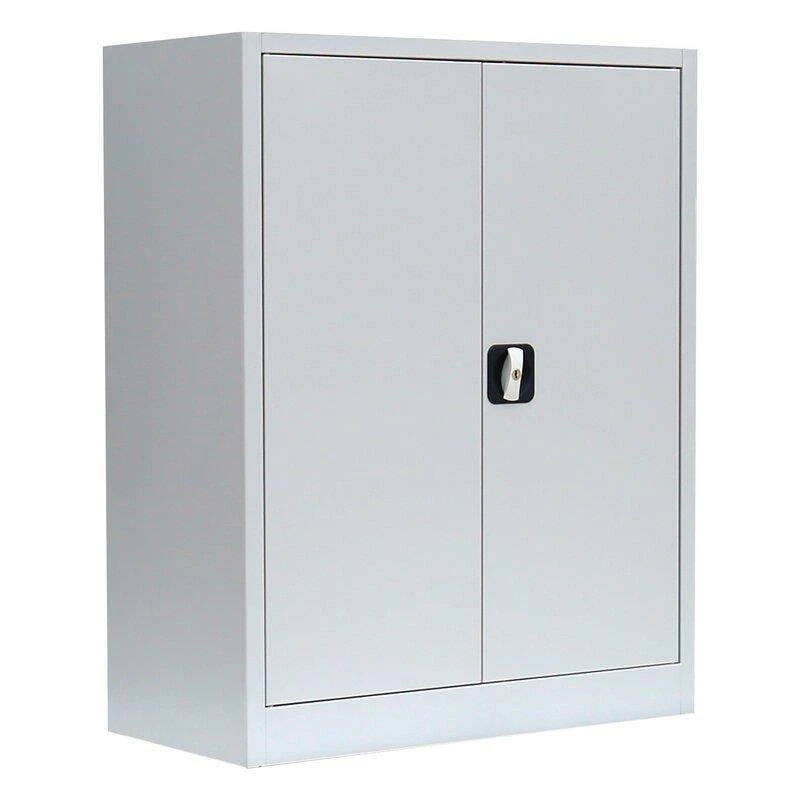 Stahl-AktenschrankLanglebige, pflegeleichte, verschweißte Stahl-Konstruktion 2 Fachboden, 2,5 Ordnerhöhen Schranktüren jeweils rechts und links angeschlagen, an gefederten Stiftscharnieren befestigt, mittig schließend Kastenverstärkung für eine erhöhte Türstabilität Flexible Nutzung als Aktenschrank oder Regal durch herausnehmbare Flügeltüren Geräuschdämpfende Kunststoff-Türanschlagspuffer serienmäßig Individuelle, flexible Innen-Einteilung durch höhenverstellbare Einlegeböden, im 5 cm-Raster Tragkraft der herausnehmbaren Einlegeböden bis zu 65 kg Einlegeböden serienmäßig in Korpusfarbe ausgeführt 2-Wege-Schubstangenzylinderschloss mit Drehgriff, inkl. 2 Schlüssel Korpus und Türen elektrostatisch, glatt pulverbeschichtet Qualität und Sicherheit Lieferung: Komplett verschweißt, keine Montage erforderlich, nur Fachböden müssen eingelegt werden Maße: 1000 x 800 x 383 mm (HxBxT) Farbe: Korpus in RAL 7035 Lichtgrau, Türen in RAL 7035 Lichtgrau