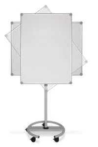 Flipchart, Höhe 1360 – 1960 mm, Tafel Höhe x Breite 970 x 660 mm, Tafeloberfläche magnethaftend, Tafel aus Stahl in alusilber, 90° drehbar zur Verwendung im Hoch- und Querformat, 2 verschiebbare Blockhalter und verschließbare Ablageschale, Gestell aus Stahl mit Pulverbeschichtung in alusilber, 5 Rollen.