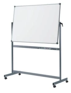 Mobile Drehtafel, Höhe x Breite x Tiefe 1950 x 2250 x 650 mm, Tafel Höhe x Breite 1000 x 2100 mm, Tafeloberfläche mit Emaillebeschichtung, magnethaftend, beschriftbar und trocken abwischbar, Tafelfläche um 360° drehbar und stufenlos arretierbar, 2 Schreibflächen und Ablageschale, Rahmen aus Aluminium eloxiert, Gestell aus Stahl in silber, mit 4 Lenkrollen.