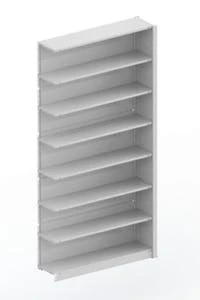 Büroregal, Bauteil Regalfeld, Stecksystem, Höhe x Breite x Tiefe 1900 x 820 x 325 mm, Feldlast 350 kg, Fachlast 60 kg, Fachbreite 800 mm, 5 Ebene(n) mit Stahlboden, Nutzung einseitig, Holz/Stahlkonstruktion, Korpus mit Melaminharzbeschichtung in RAL7035 Lichtgrau, Ebenen mit Pulverbeschichtung in RAL7035 Lichtgrau, Lieferumfang 1 Seitenwange, Ebenen gemäß Angebot.