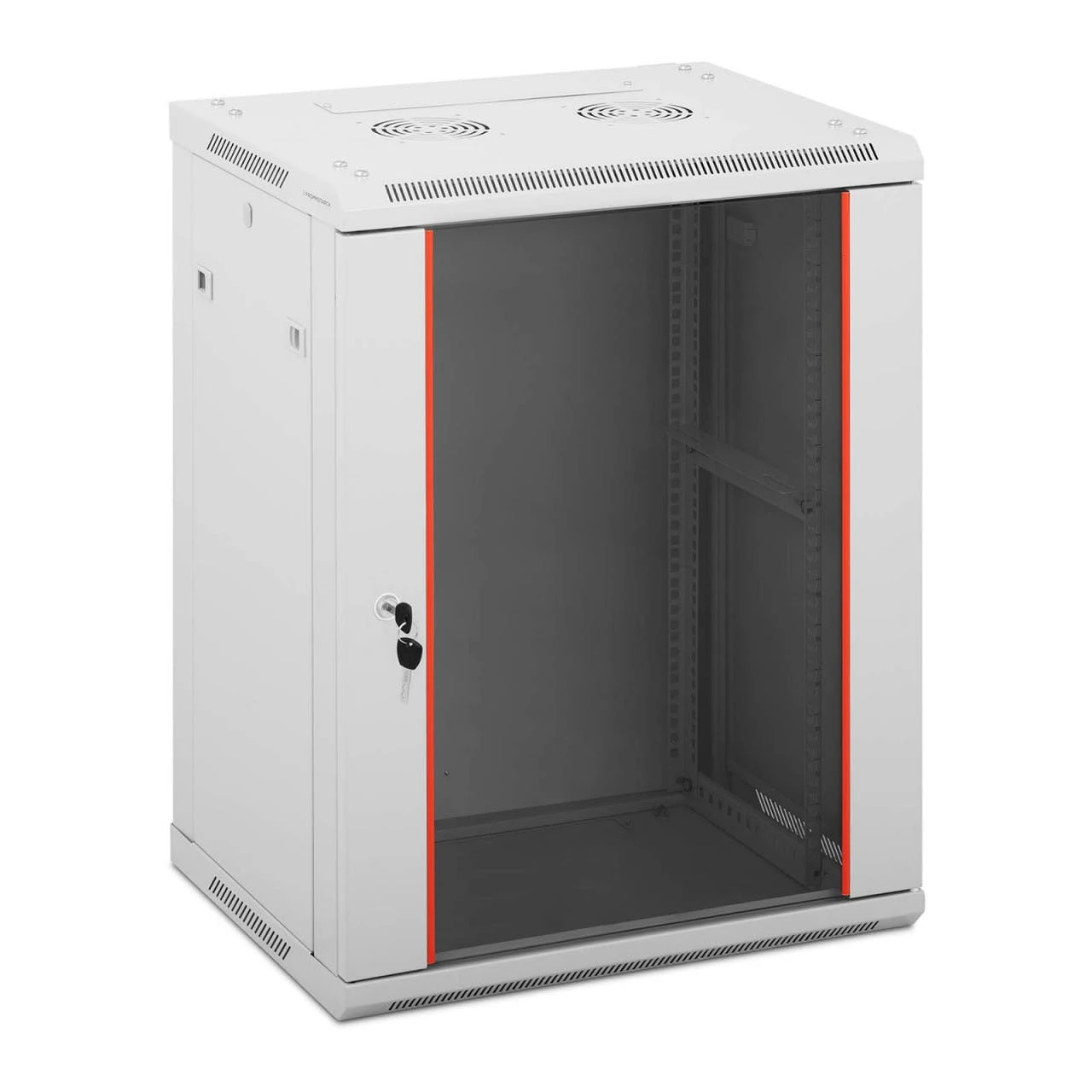 Serverschrank – 19 Zoll – 15 HE – abschließbar – bis 60 kg – grau. Der abschließbare 19 Zoll Serverschrank für Ihr Netzwerk. Ob im Büro, in der Schule, in der Fabrik oder im heimischen Arbeitszimmer: Der hochwertige Serverschrank STAR_DC.19.15.S_01 von Fromm & Starck, den Experten für Büroeinrichtung, ist das unverzichtbare Rack für die sichere Aufbewahrung Ihres genormten 19 Zoll Netzwerk-Equipments mit einer Höhe von bis zu 15 HE. Der vielseitige Netzwerkschrank aus dem Industriebedarf von Fromm & Starck. Durch die Fronttür mit gehärtetem Sicherheitsglas haben Sie Ihre aktiven und passiven Netzwerkkomponenten immer im Blick, ohne dass Sie jedes Mal die Tür aufschließen und öffnen müssen, um nachzusehen, ob alles funktioniert. Dank des variablen Türanschlags kann die Tür so angebracht werden, dass sie im 180° Winkel nach links oder rechts öffnet. Durch die Kabelschlitze oben und unten im grauen Gehäuse des 19 Zoll Serverschranks können Sie problemlos die Verkabelung führen. Unbenutzte Kabelschlitze werden mit einer Metallplatte zugeschraubt. Zudem sind die Rückwand sowie beide Seitenwände des Datenschranks leicht entfernbar und wieder einsetzbar, damit Sie etwa zur Installation oder Wartung jederzeit an die hinteren Steckverbindungen kommen. Die beiden tiefenverstellbaren Profilschienen im Schrankinneren haben eine Skala mit Höheneinheiten. Viele Lüftungsschlitze und -löcher sorgen für die passive Entlüftung des Servers im Inneren des Netzwerkschranks 19 Zoll und gewährleisten somit stets eine optimale Betriebstemperatur. Aufgrund der vorgebohrten Löcher im Gehäusedeckel besteht die Möglichkeit zur Installation von zwei nicht im Lieferumfang enthaltenen Lüftern zur aktiven Belüftung. Der Serverschrank 19″ aus langlebigem Stahlblech kann auf den Boden gestellt oder dank der vier Bohrungen an der Gehäuserückseite und der vier mitgelieferten Verankerungsschrauben auch an eine Wand montiert werden.