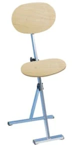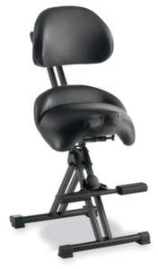 Klappbare XXL-Stehhilfe, belastbar bis 200 kg, Sattelsitz, Sitzbezug aus Kunstleder in schwarz, Sitz Höhe 590 – 730 mm, Sitz klappbar, Rückenbezug aus Kunstleder in schwarz, Rücken pendelnd gelagert und höhenverstellbar, Sitz und Rücken gepolstert, Höhenverstellung über Handrad, mit höhenverstellbarer Aufstiegshilfe, Gestell aus Stahl mit Pulverbeschichtung in RAL9005 Tiefschwarz, Gestell mit Gleiter und Rollen.