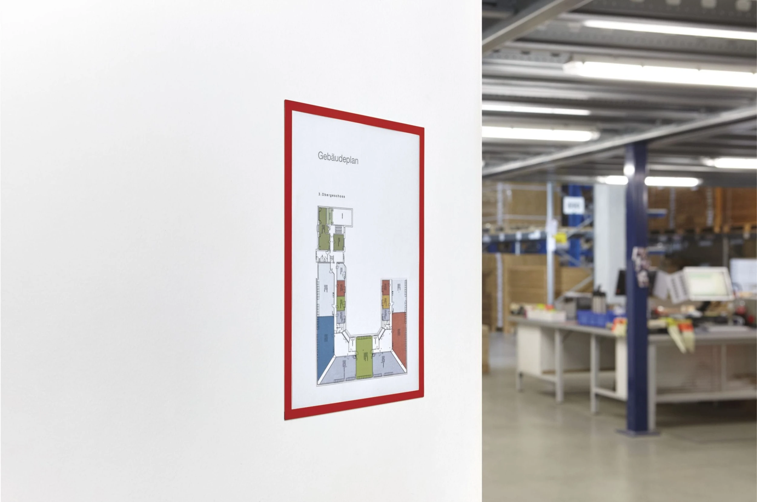 Farbiger Magnetrahmen zum Aushängen betrieblicher Informationen: Für Büro, Lager + Fertigung, ideal auch für TQM-Infotafeln. Magnethaftend auf allen eisenhaltigen Oberflächen wie Whiteboards, Maschinen, Metallschränken und -türen Schützt Dokumente + verleiht ihnen den angemessenen Rahmen Hoch + quer einsetzbar Dokumentenwechsel schnell + einfach möglich: Eine Ecke anheben – Dokument wechseln – Ecke loslassen – fertig! VE = 5 Stück.