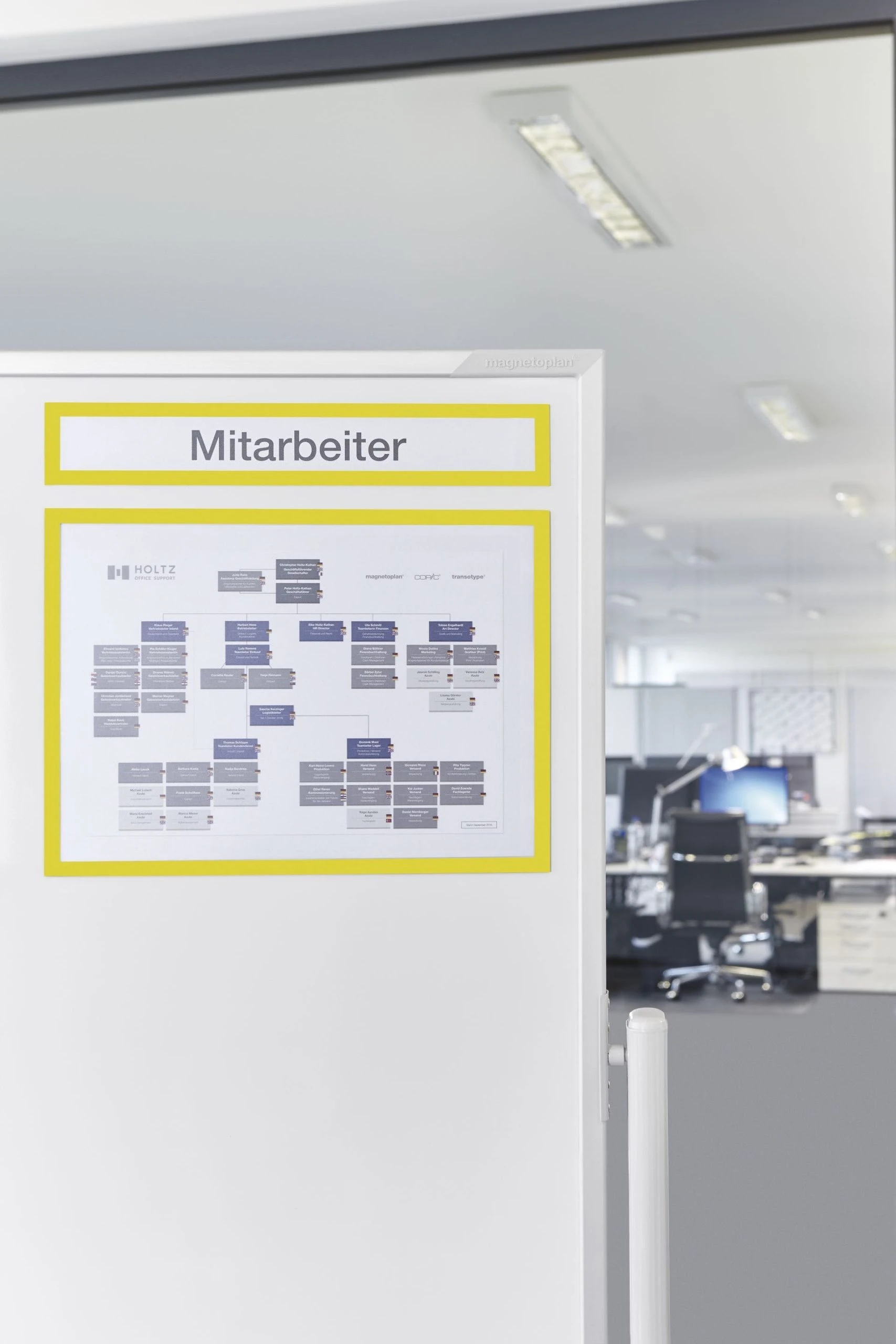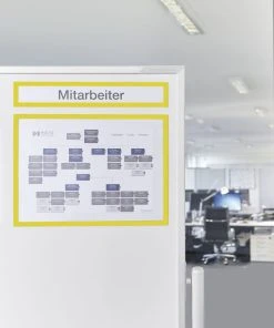 Farbiger Überschiften-Rahmen zum Beschriften von Whiteboards: Für Büro, Lager + Fertigung, ideal auch für TQM-Infotafeln Magnethaftend auf allen eisenhaltigen Oberflächen Schützt Informationen + verleiht ihnen den angemessenen Rahmen Überschriftenwechsel schnell + einfach möglich: Eine Ecke anheben – Dokument wechseln – Ecke loslassen – fertig! Größe: 319 x 52 mm, A4 hoch VE = 5 Stück.