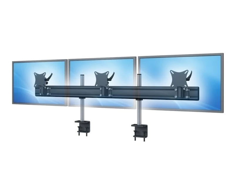 Die MonLines Monitor Tischhalterung Flat-System 3-fach TK WS in grau ist eine Multi-Monitor-Halterung mit Tischklemmbefestigung von 3 Monitoren an 2 Traversen mit einer Tragkraft von 15 kg pro Monitorhalterung und einem VESA Standard 75×75 und 100×100 mm.
