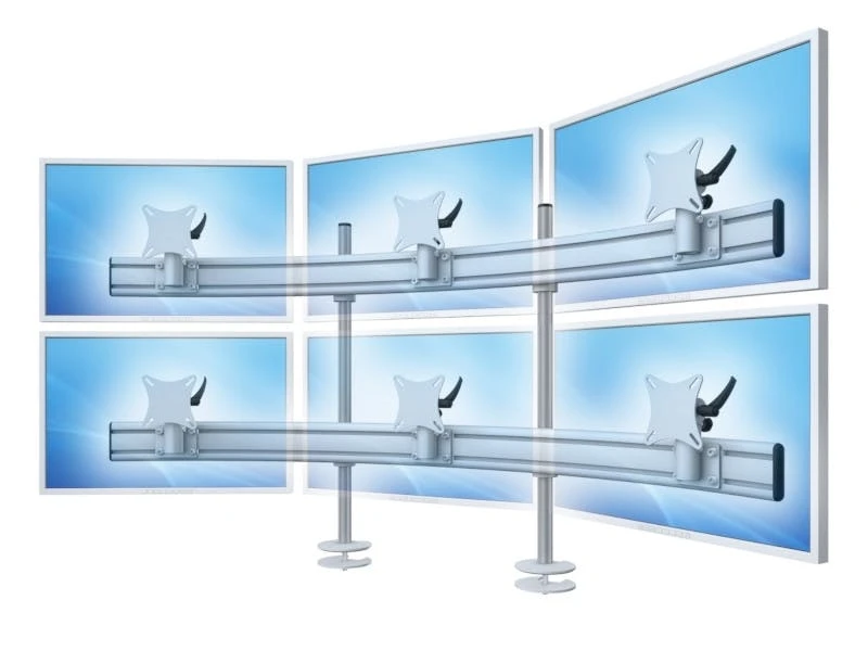 Die MonLines Para 3+3 Monitor Tischhalterung Einbau MA 25-32Zoll WS XL in grau ist eine Multi-Monitor-Halterung mit Durchschraubbefestigung von drei Monitoren an jeweils 2 Traversen mit einer Tragkraft von 15 kg pro Monitorhalter mit VESA-Standard 75×75 und 100×100 mm.