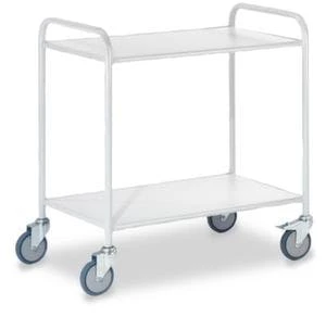 Ordnerwagen, Traglast 150 kg, mit 3 Etage(n), Ladefläche Länge x Breite 728 x 315 mm, mit Abrollrand, Gestell mit Pulverbeschichtung in RAL7001 Silbergrau, Stahlkonstruktion, Platte aus Holz mit Kunststoffbeschichtung in Dekor RAL7035 Lichtgrau, Höhe x Länge x Breite 1015 x 950 x 455 mm, 4 Lenkrollen, Rad Ø 100 mm, 2 Lenkrollen mit Feststellern.