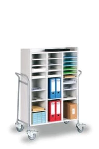 Ordnerwagen, Traglast 150 kg, mit 4 Etage(n), Ladefläche Länge x Breite 728 x 315 mm, mit Abrollrand, Gestell mit Pulverbeschichtung in RAL7001 Silbergrau, Stahlkonstruktion, Platte aus Holz mit Kunststoffbeschichtung in Dekor RAL7035 Lichtgrau, Höhe x Länge x Breite 1380 x 950 x 455 mm, 4 Lenkrollen, Rad Ø 100 mm, 2 Lenkrollen mit Feststellern.