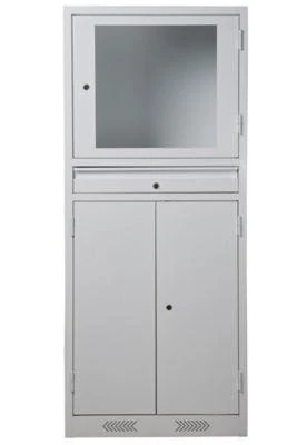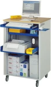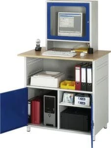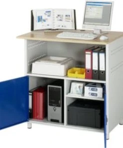 PC-Schrank, Höhe x Breite x Tiefe 1100 x 1100 x 800 mm, Steckdosenleiste mit Schalter, 1 offenes Fach, 1 Schrank mit Mitteltrennwand, Seitenwände mit Systemlochung, rechte Seite im Schrank mit 1 verstellbarem Boden, Doppel-Flügeltür, 1 Ebene(n), Unterbau Bodenausgleichsschrauben, Stahlkonstruktion, Korpus mit Pulverbeschichtung in RAL7035 Lichtgrau, Front mit Pulverbeschichtung in RAL5010 Enzianblau, Platte aus Holz mit Melaminharzbeschichtung in Dekor Buche.