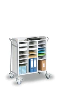 Postwagen, Traglast 150 kg, mit 15 Fächern, mit Abrollrand, Gestell mit Pulverbeschichtung in RAL7001 Silbergrau, Stahlkonstruktion, Höhe x Länge x Breite 1015 x 950 x 455 mm, 4 Lenkrollen, Rad Ø 100 mm, 2 Lenkrollen mit Feststellern, Radanordnung parallel.