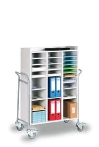 Postwagen, Traglast 150 kg, mit 21 Fächern, mit Abrollrand, Gestell mit Pulverbeschichtung in RAL7001 Silbergrau, Stahlkonstruktion, Höhe x Länge x Breite 1380 x 950 x 455 mm, 4 Lenkrollen, Rad Ø 100 mm, 2 Lenkrollen mit Feststellern, Radanordnung parallel.
