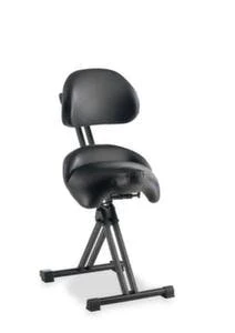 Stehhilfe, mit Sitzneigungsverstellung und zusätzlich drehbar, Sitzbezug aus Kunstleder in schwarz, mit Tragegriff, Sitz Höhe 610 – 860 mm, Sitz gepolstert, Gestell aus Stahl in schwarz, schräge Mittelsäule.