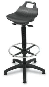 Stehhilfe, mit Sitzneigungsverstellung, Sitz aus Kunststoff in schwarz, Sitz Höhe 600 – 860 mm, Höhenverstellung über Gasfeder, mit Fußring, Gestell aus Kunststoff in schwarz, Gestell mit Gleiter.
