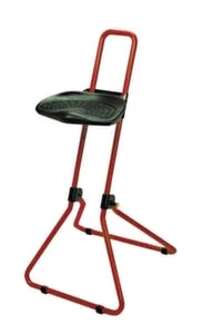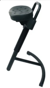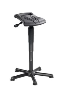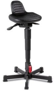 Stehhilfe, mit Sitzneigungsverstellung, Sitz aus PU-Schaum in schwarz, mit Griffloch, Sitz Höhe 590 – 875 mm, Höhenverstellung über Gasfeder, Gestell aus Stahl mit Epoxidharzbeschichtung in RAL9005 Tiefschwarz, Gestell mit Gleiter und Rollen.