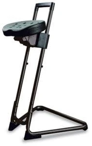 Stehhilfe, mit Sitzneigungsverstellung und zusätzlich drehbar, Sitz aus PU-Schaum in schwarz, Sitz Höhe 620 – 890 mm, Höhenverstellung über Gasfeder, Gestell aus Stahl in schwarz, Gestell mit Gleiter.