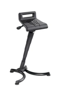 Stehhilfe, Sitz aus PU-Schaum in schwarz, Sitz Höhe x Breite x Tiefe 670 – 910 x 366 x 333 mm, Höhenverstellung über Gasfeder, Gestell aus Stahl mit Epoxidharzbeschichtung in RAL9005 Tiefschwarz, schräge Mittelsäule, Gestell mit Gleiter und Rollen.