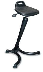 Stehhilfe, mit Sitzneigungsverstellung und zusätzlich drehbar, Sitzbezug aus Stoff in schwarz, mit Tragegriff, Sitz Höhe 610 – 860 mm, Sitz gepolstert, Gestell aus Stahl in schwarz, schräge Mittelsäule.