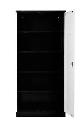 Der Stahlschrank ist komplett aus Metall gefertigt. Die Oberflächen sind aus elektrostatisch pulverbeschichtetem Metall hergestellt und dadurch besonders robust. Die vier Fachböden sind in 5 cm Abständen in der Höhe verstellbar. So bietet der Metallschrank auf insgesamt fünf Ordnerhöhen reichlich Stauraum. Der Schrank ist zusätzlich abschließbar und es werden zwei Schlüssel mitgeliefert.