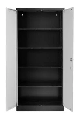 Der Stahlschrank ist komplett aus Metall gefertigt. Die Oberflächen sind aus elektrostatisch pulverbeschichtetem Metall hergestellt und dadurch besonders robust. Die vier Fachböden sind in 5 cm Abständen in der Höhe verstellbar. So bietet der Metallschrank auf insgesamt fünf Ordnerhöhen reichlich Stauraum. Der Schrank ist zusätzlich abschließbar und es werden zwei Schlüssel mitgeliefert.