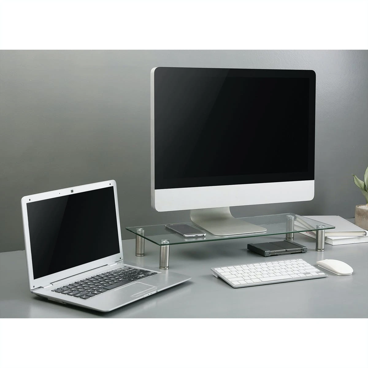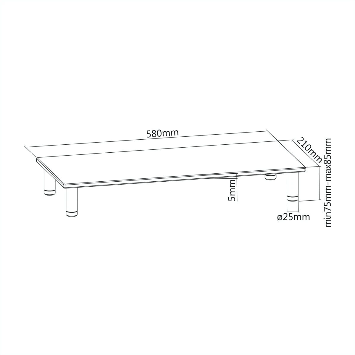 Erlaubt die platzsparende Aufstellung von Monitoren auf einer erhöhten Position. Großzügige Stellfläche auf der Plattform – neben dem Monitor ist noch Raum für Lautsprecher oder andere Geräte. Unter der Monitor-Plattform ist viel Platz für Dokumente oder auch zur temporären Aufbewahrung der Tastatur. Belastbar bis 20kg. Glasdicke: 5 mm. Plattformgrösse: 580 x 210 mm. Bauhöhe 75 – 85 mm. Freiraumbreite ca. 500 mm