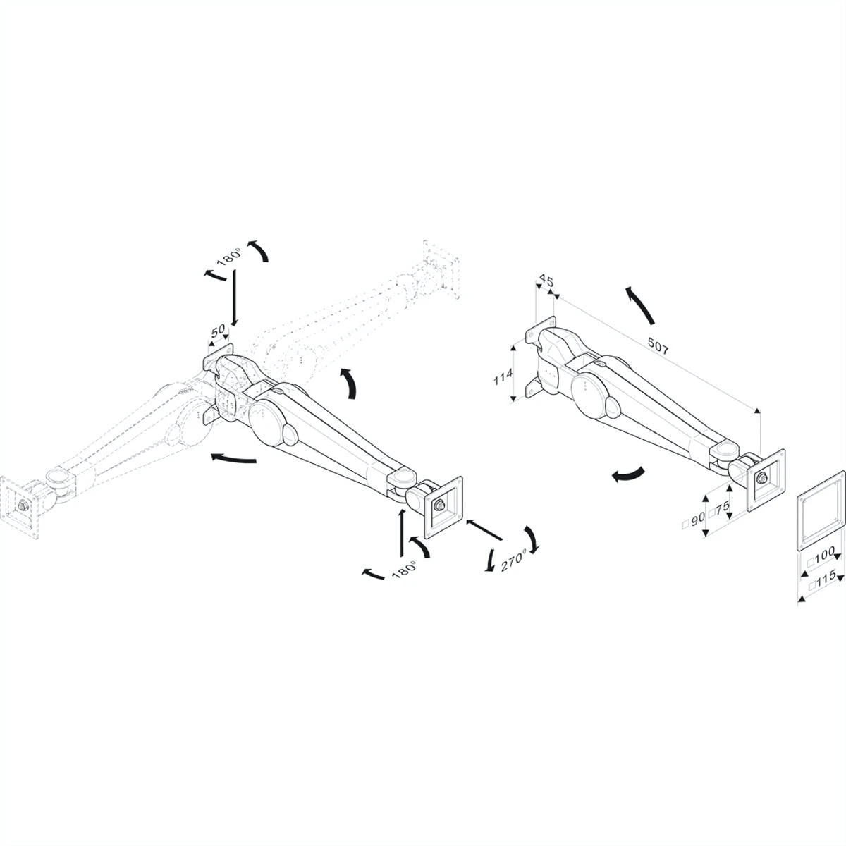 Viele Drehpunkte erlauben es, den besten Blickwinkel für den Betrachter einzustellen. Das Gewicht des Monitors ist einstellbar. Für die Wandmontage. Zur Befestigung von Bildschirmen mit VESA 75 (75x75mm) bzw. VESA 100 (100x100mm). Belastbarkeit: 3 – 8 kg. Kabelführung im Arm