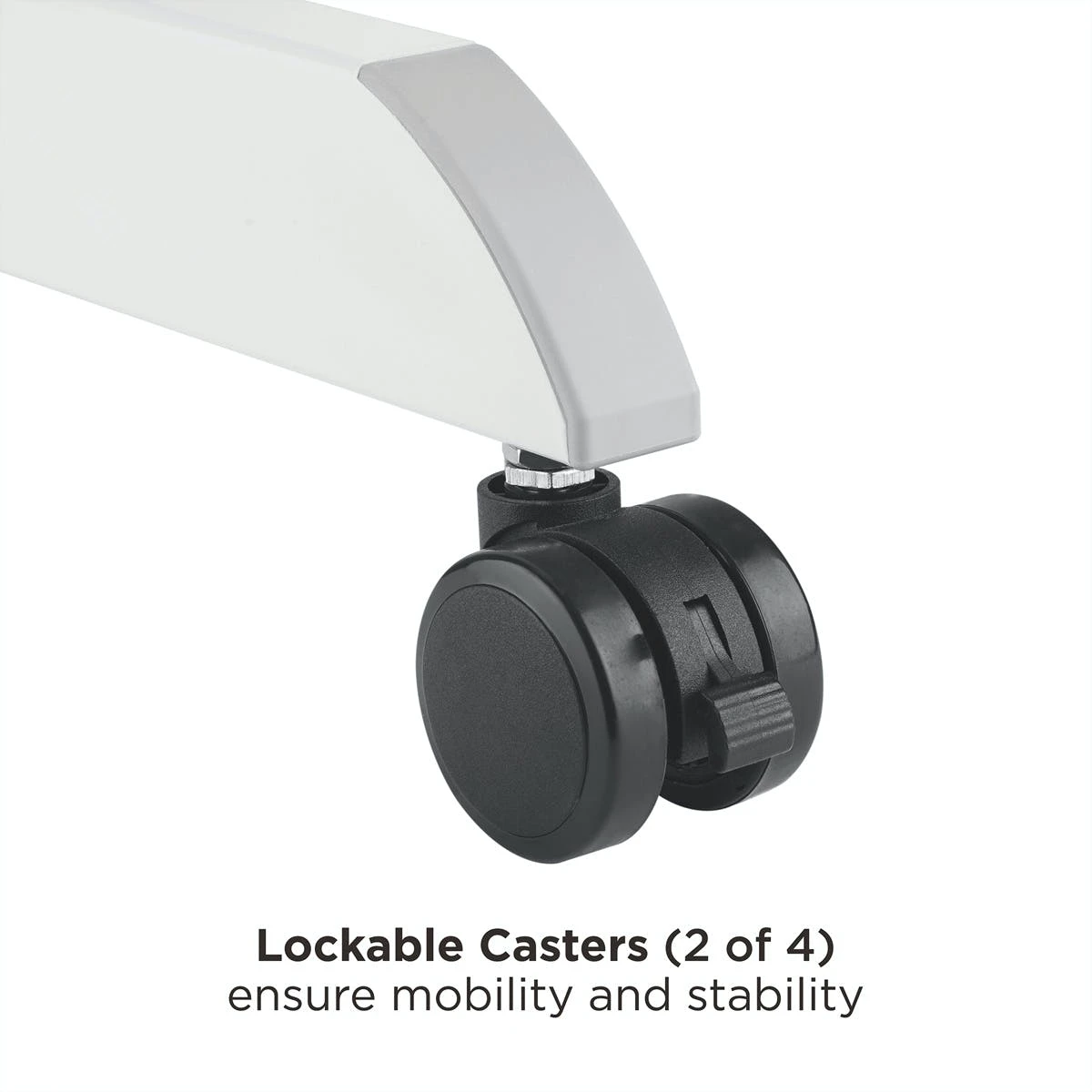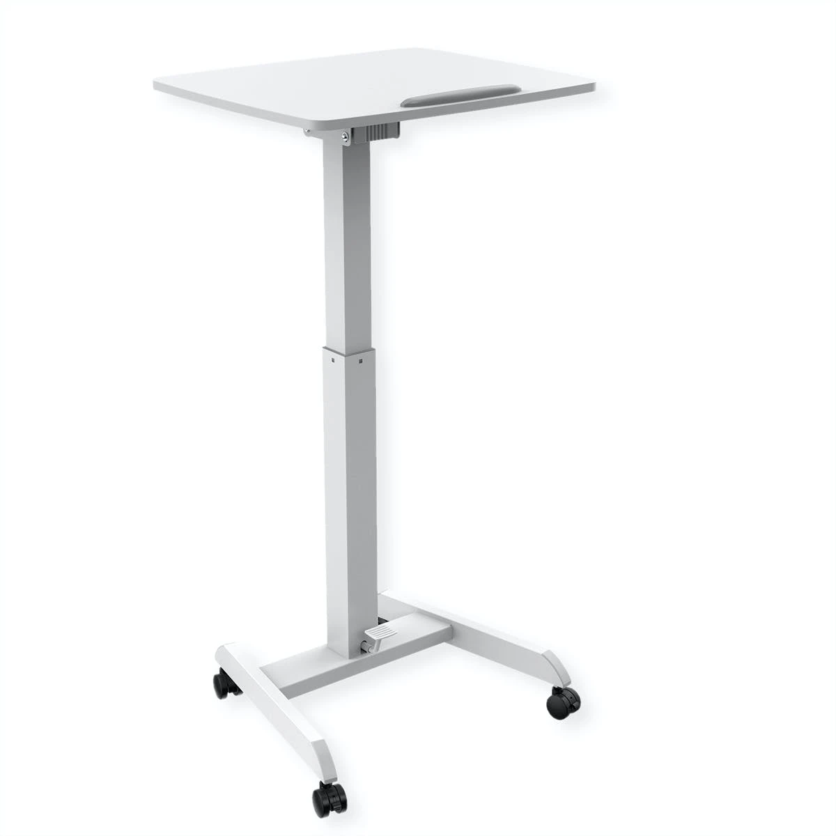 Arbeiten Sie gesünder! Ein Wechsel von Sitzen und Stehen ist gut für Ihre Wirbelsäule. Mit dem höhenverstellbaren ROLINE PC-Arbeitstisch können Sie jetzt die Arbeit wahlweise sitzend oder im Stehen erledigen.. . Pneumatische Höhenverstellung für die einfache Einstellung der idealen Arbeitshöhe. Anpassung der Höhe (82 bis 119 cm) über ein Fusspedal. Stabiles Metall-Kunststoffgestell. Arbeitsfläche in vier Stufen (0° /10° / 20° / 30°) neigbar – zum Lesen oder auch für Präsentationen. Arbeitsfläche (B x T: 60 x 52 cm). Mobil durch 4 Rollen, davon zwei feststellbar. Farbe: Gestell in weiss, Platte in weiss mit Umrandung. Abmessungen (H x B x T): min. 82 / max. 119 cm x 60 cm x 53,1 cm. Max. Tragkraft: 8 kg.