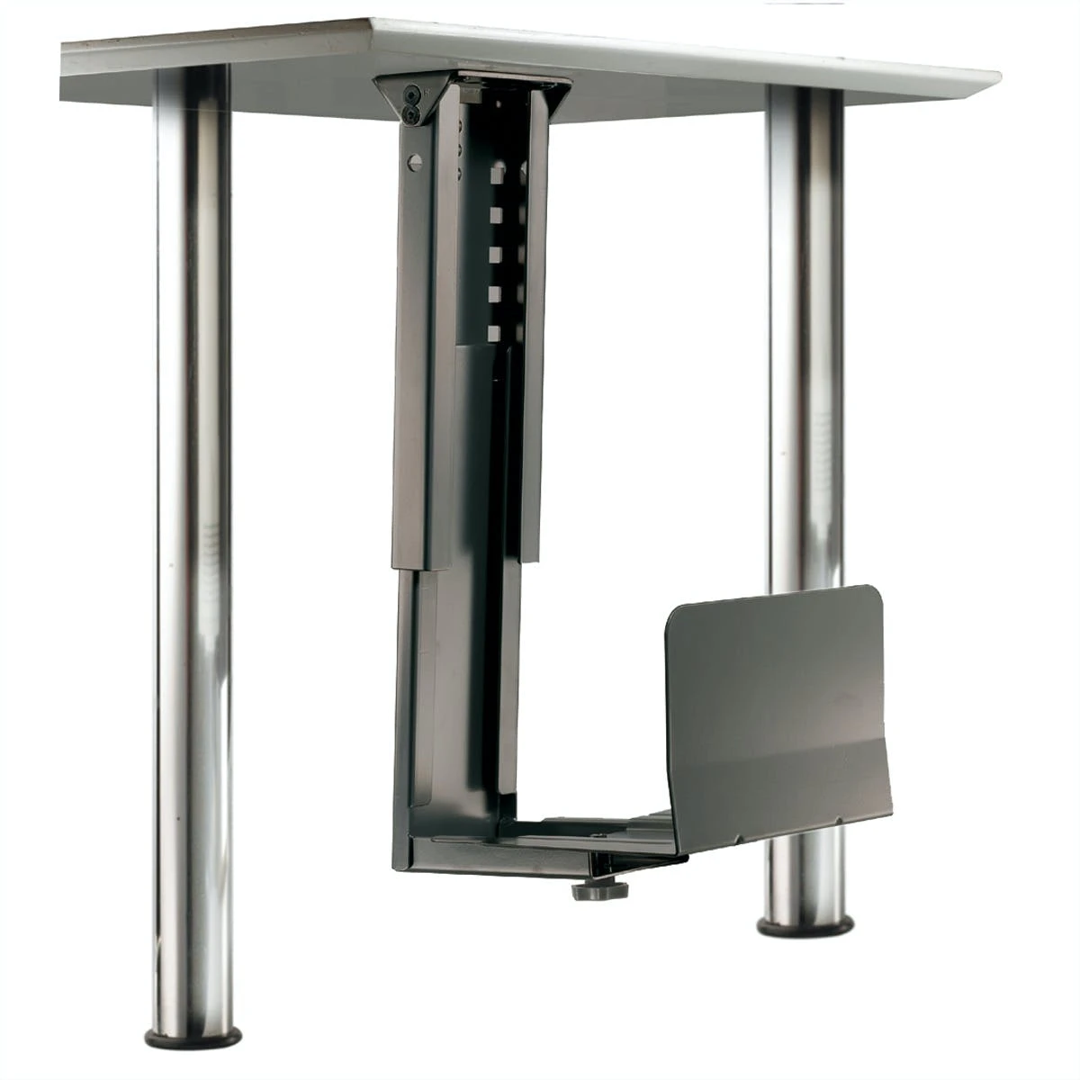 Platzsparender PC Halter, schafft mehr Platz auf Ihrem Arbeitstisch. Stabile Stahlkonstruktion. Befestigung unter der Tischplatte, Schrauben nicht im Lieferumfang enthalten. Höhe und Breite einstellbar. Hinweis: Farbe schwarz