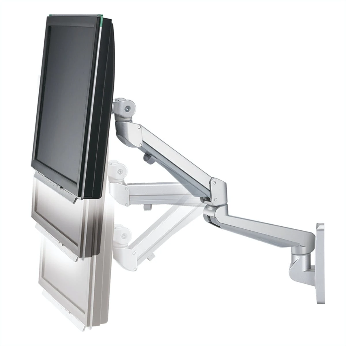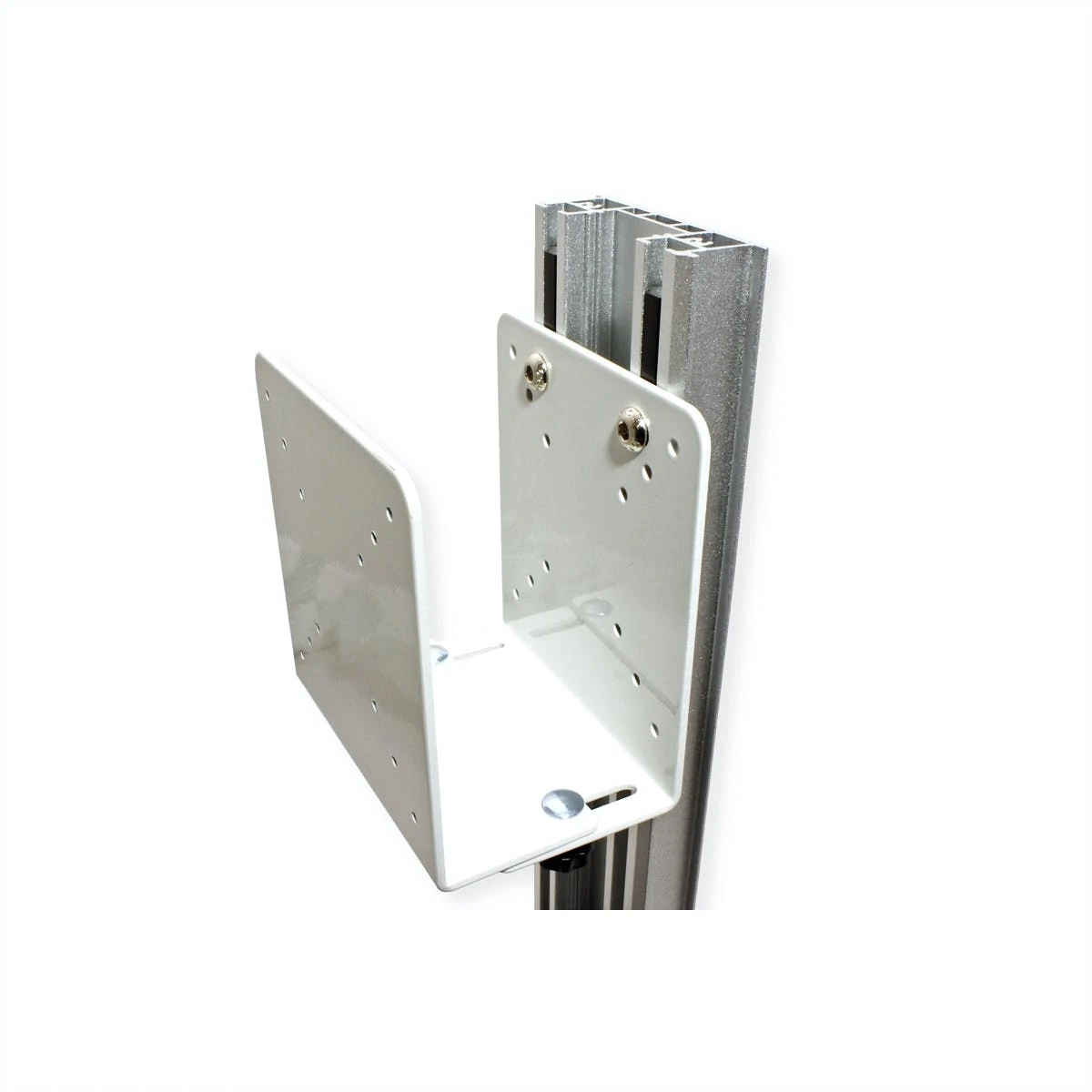 Die Arme für Monitor und Tastatur/Maus können bei Nichtgebrauch eng an die Wand gefaltet werden.. Der PC-Arbeitsplatz basiert auf einer Schiene, bestehend aus zwei Teilen (jeweils 90,5 mm breit, 500 mm lang, 20 mm tief) aus Aluminum, die an die Wand geschraubt werden. Daran befestigt sind ein CPU-Halter, ein Monitor-Arm und ein Tastatur/Maus-Arm.. Der Monitor-Gelenk-Arm kann in der Neigung verstellt, geschwenkt und gedreht werden. Zur Befestigung von Bildschirmen mit VESA 75 (75x75mm) bzw. VESA 100 (100x100mm). Der CPU-Halter ist in der Tiefe verstellbar und kann Geräte bis 100 mm Breite sicher halten; er beinhaltet Gleitschutz-Polster zur Vermeidung von Kratzern. Tragkraft des CPU-Halters: bis 10kg. Tragkraft des Tastatur/Maus-Arms: 3 – 5 kg. Tragkraft des Monitor-Arms: 3 – 5 kg