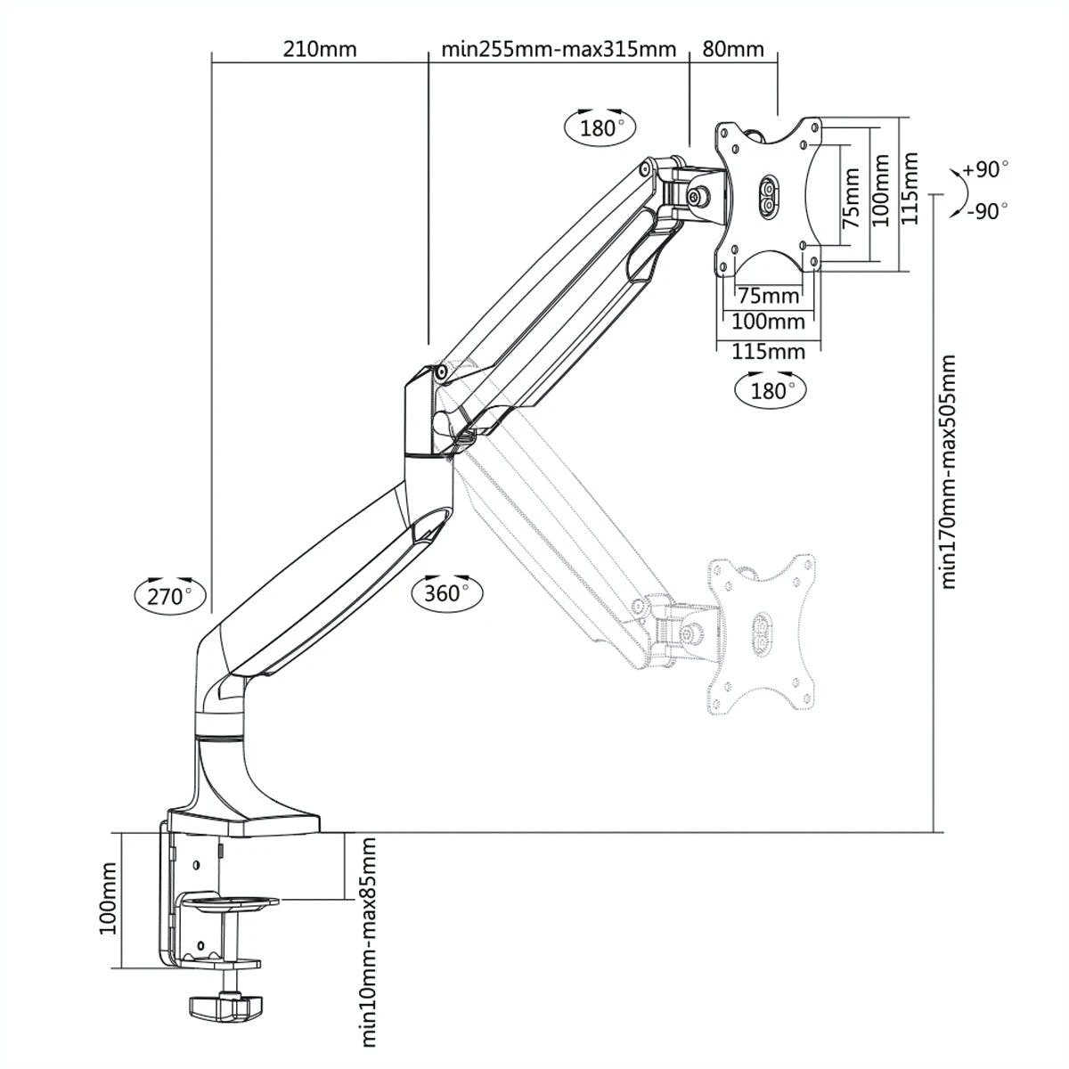Über 6 Drehpunkte kann der beste Blickwinkel für den Betrachter eingestellt werden. Pivotfunktion (Monitor ist 90° drehbar, für Hoch- und Querformat). Zur Befestigung von Bildschirmen mit VESA 75 (75x75mm) bzw. VESA 100 (100x100mm). VESA-Befestigung kann separat an den Bildschirm geschraubt und nachträglich in den Arm gehängt werden. Gewicht des Monitors einstellbar. Mit Schraubklammer für die Tischmontage. Kabelführung im Arm. Armlänge bis 580 mm. Belastbarkeit bis 9 kg