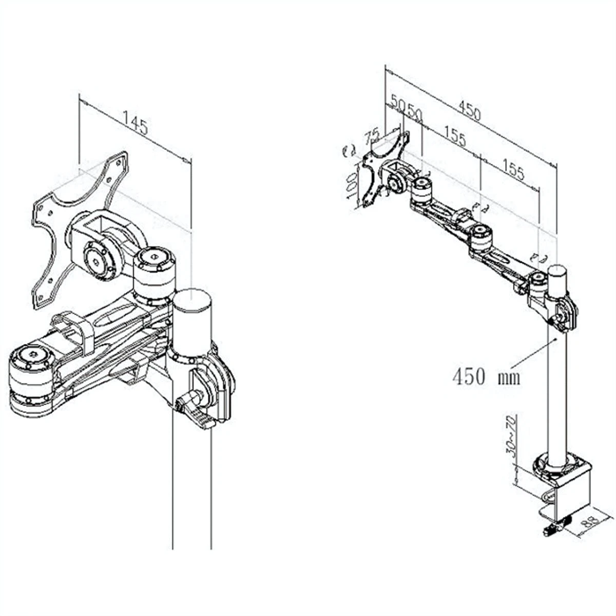 Zum Klemmen an der Tischkante bis zu einer Plattenstärke von 8cm. Der Monitorarm ist an der Trägerstange höhenverstellbar. Zur Befestigung von Bildschirmen mit VESA 75 (75x75mm) bzw. VESA 100 (100x100mm). Tragkraft: bis 10kg