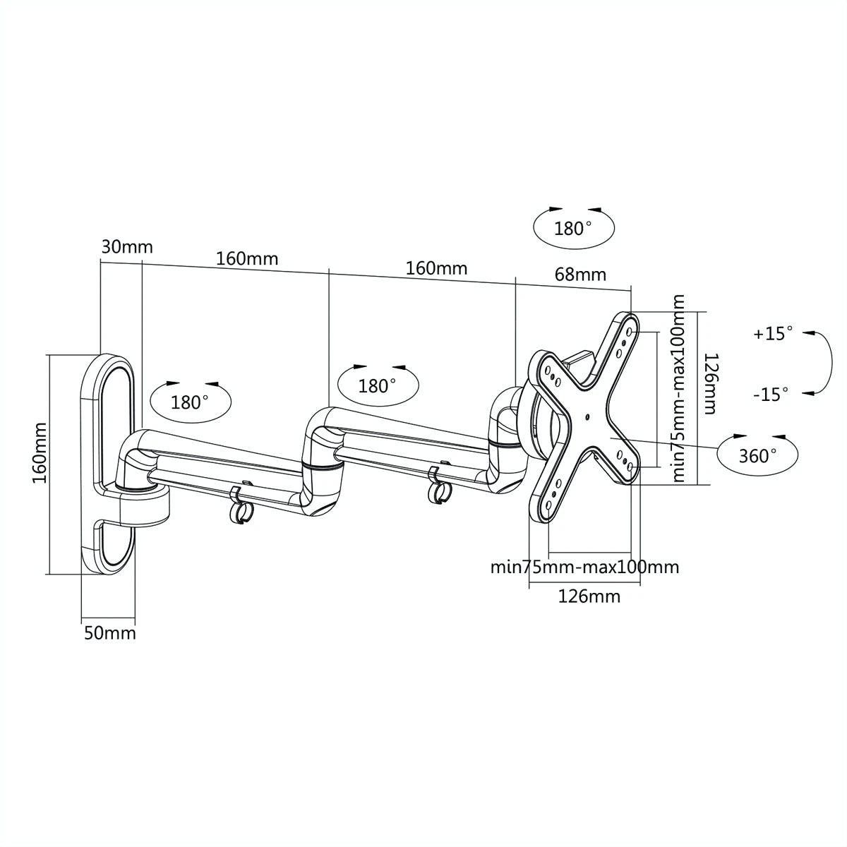 Zur Wandmontage. Zur Befestigung von Bildschirmen mit VESA 75 (75x75mm) und VESA 100 (100x100mm). Monitorkabel kann mit beiliegenden Clips am Monitorarm befestigt werden