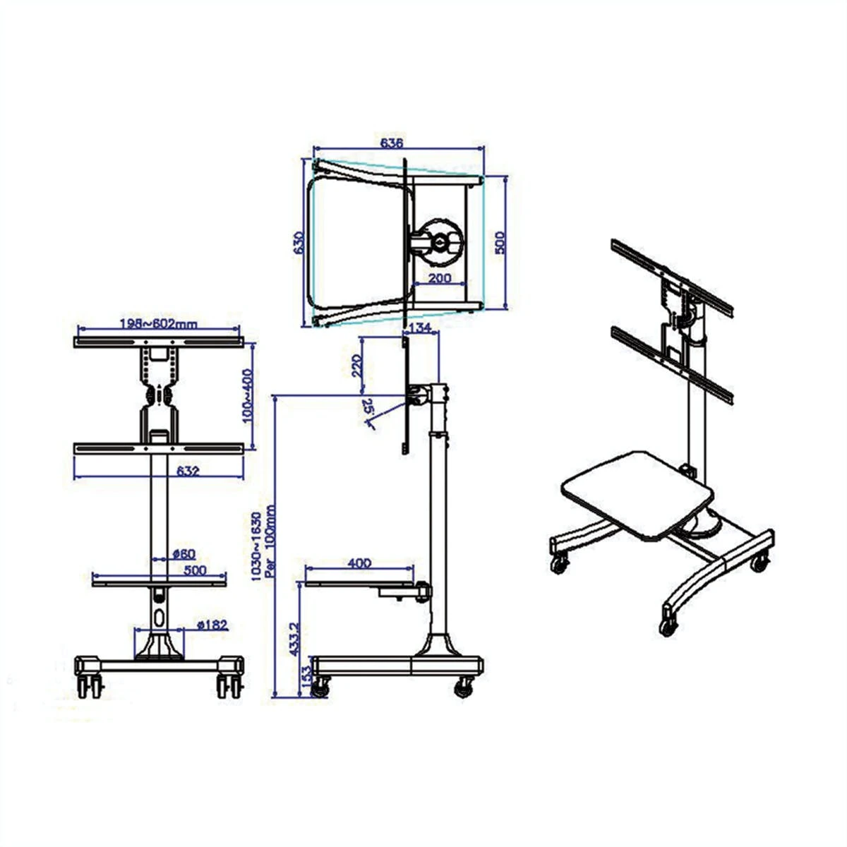 Der LCD Monitor Rollständer für einfache mobile Nutzung eines großen LCD Monitors oder TV. Zur Befestigung von Bildschirmen mit:. Horizontalbestigung: 10 bis 60cm . Vertikalbefestigung: 10 bis 40cm. Für LCD Monitore bis 35 kg. Bildschirmdiagonale: 69 – 107 cm. Einstellbare Höhe: 120 – 160 cm. Stellplatte für z.B. einen DVD-Player. Kabelschacht im Vertikalträger
