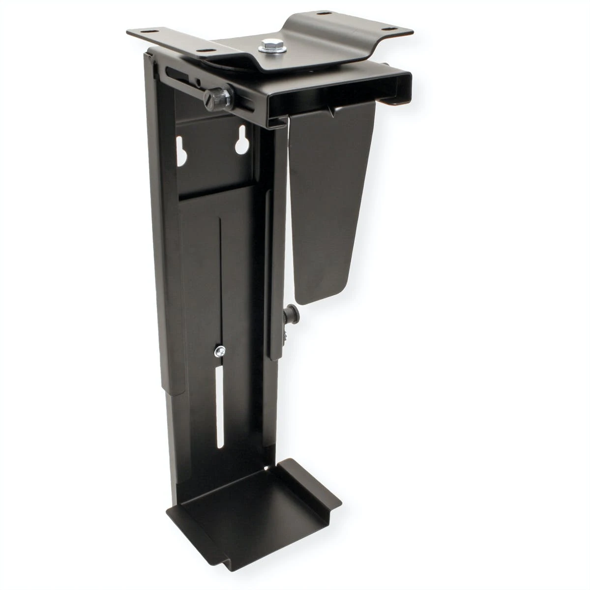 Platzsparender PC-Halter, für mehr Platz auf Ihrem Arbeitstisch. Stabile Stahlkonstruktion. Befestigung unter der Tischplatte (mind. 15mm), Schrauben nicht im Lieferumfang. Alternativ Wandmontage möglich. Tragkraft: 10 kg. Höhenverstellbar: 300 – 533 mm. Breitenverstellbar: 88 – 203 mm.
