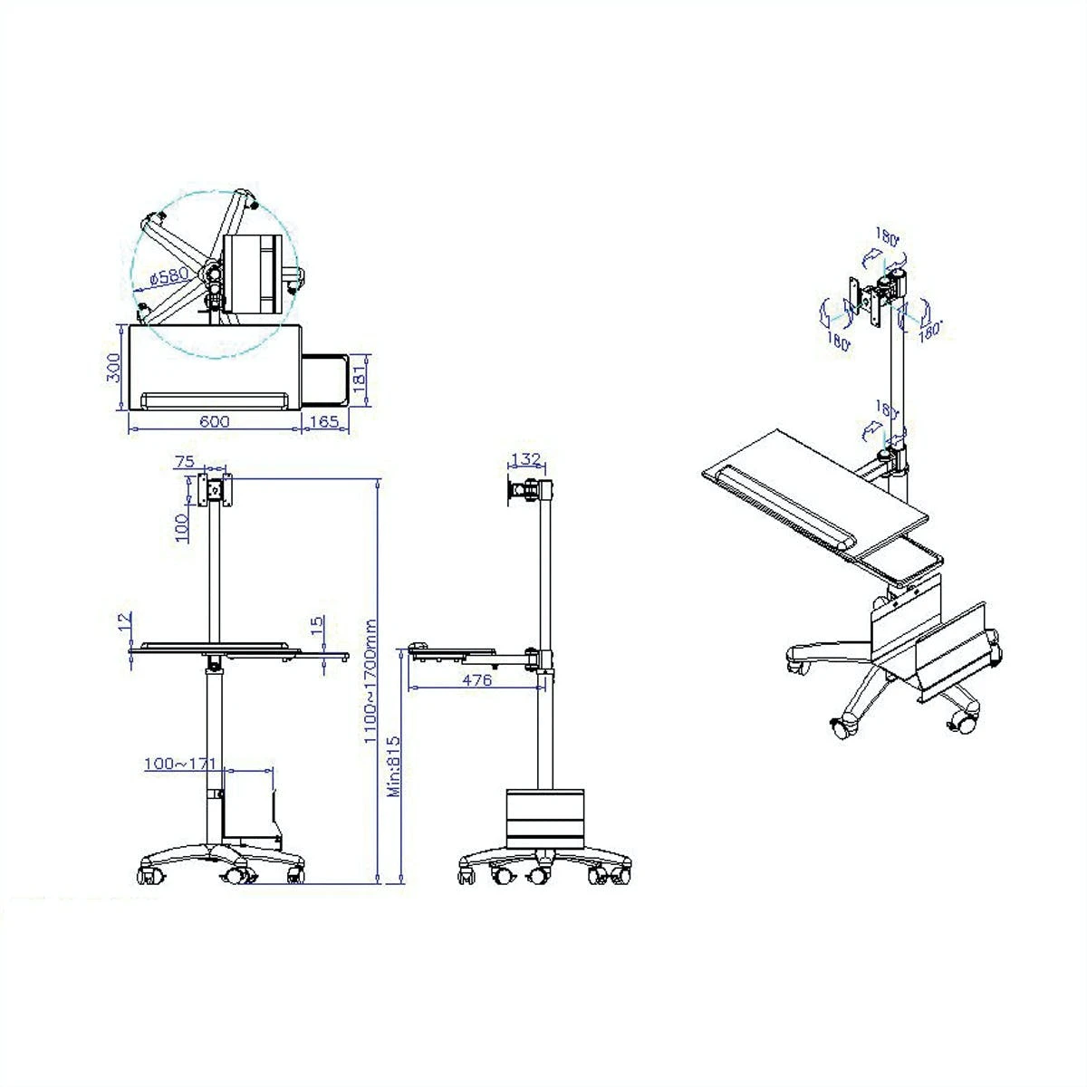 Die Höhe des Monitors und von Tastatur und Maus sind einstellbar. Zur Befestigung von Bildschirmen mit VESA 75 (75x75mm) bzw. VESA 100 (100x100mm). Tragkraft : max. 10 kg. Kippbares Monitorgelenk. Höhe: 110-170 cm einstellbar